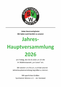 Protokoll der Jahreshauptversammlung des Sportvereins Wüsten vom 23. Mai 2025 Am 23. Mai fand im Waldrestaurant „Zur Loose“ die Jahreshauptversammlung des SV Wüsten e.V. statt. Alle Mitglieder wurden schriftlich und satzungsbezogen zu dieser Versammlung eingeladen. Um 20.03 Uhr begrüßt der Vorsitzende Berthold Conrads 20 Mitglieder. Das Protokoll der letzten Versammlung wurde an verschiedenen Stellen zur… Jahres-Hauptversammlung am 06.03.2026 um 20 Uhr weiterlesen - Die Mädels des SV Wüsten suchen Verstärkung
